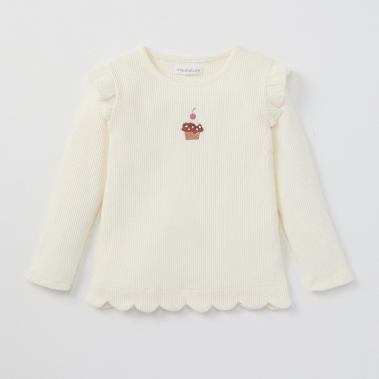 テレコ素材の長袖Tシャツです。カップケーキの刺しゅうがワンポイントになっています♪冬~春にかけて活躍する1枚です。