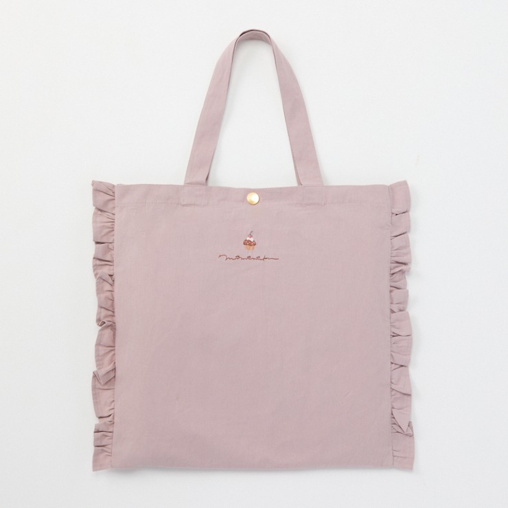 くすみピンクの生地にフリルとカップケーキの刺しゅうが入ったガーリーなデザインが特徴のかわいいバッグです♪