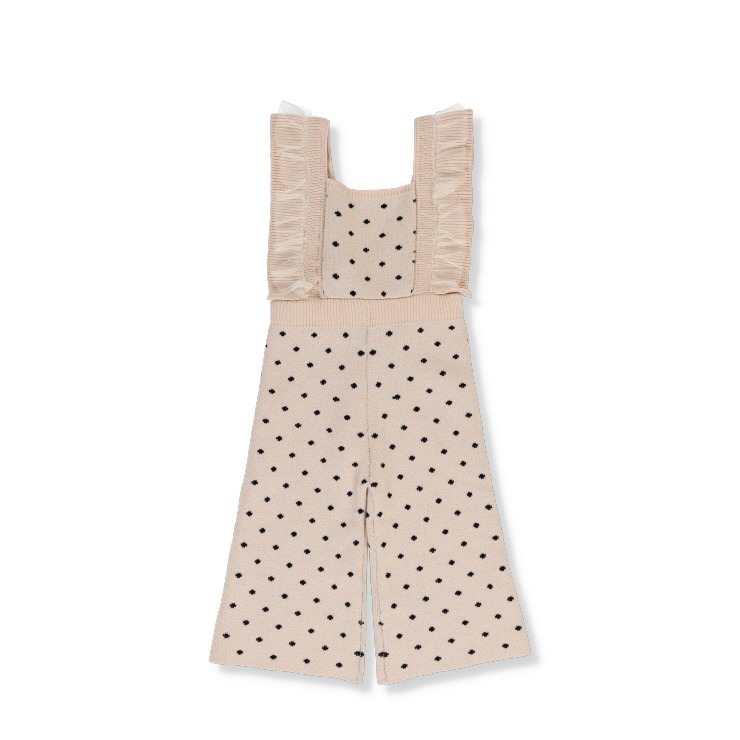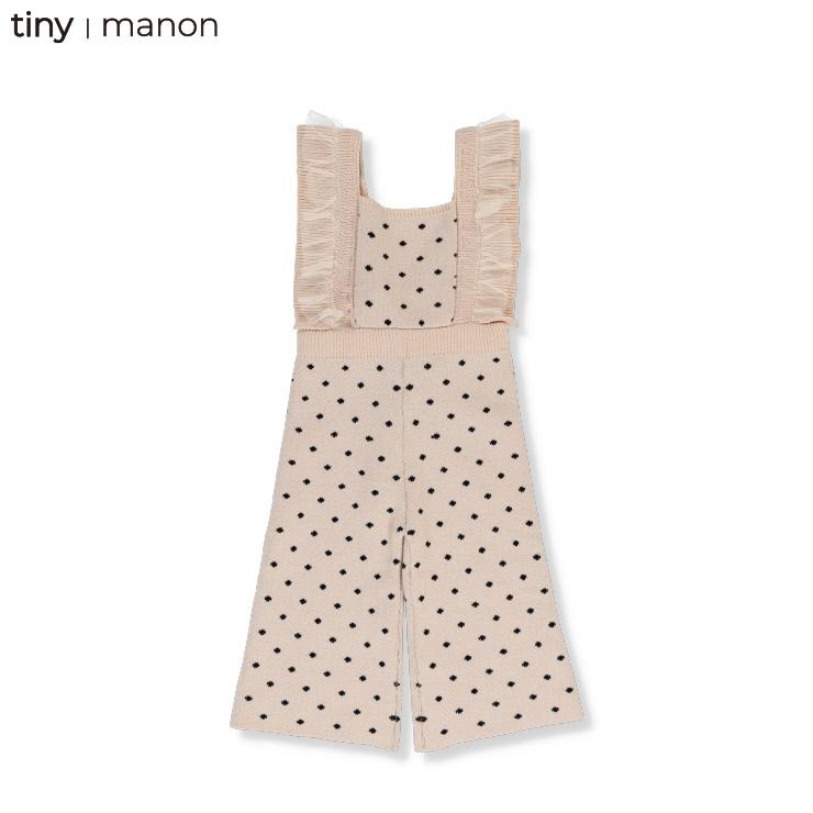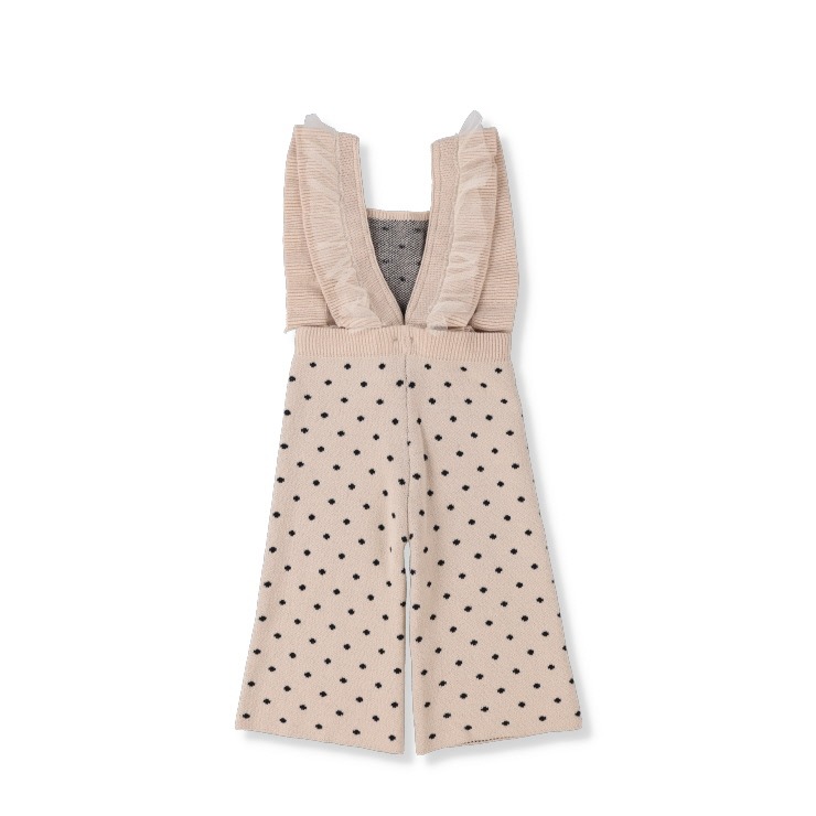 肩のフリルとドット柄が可愛い、ガーリーなオーバーオール。