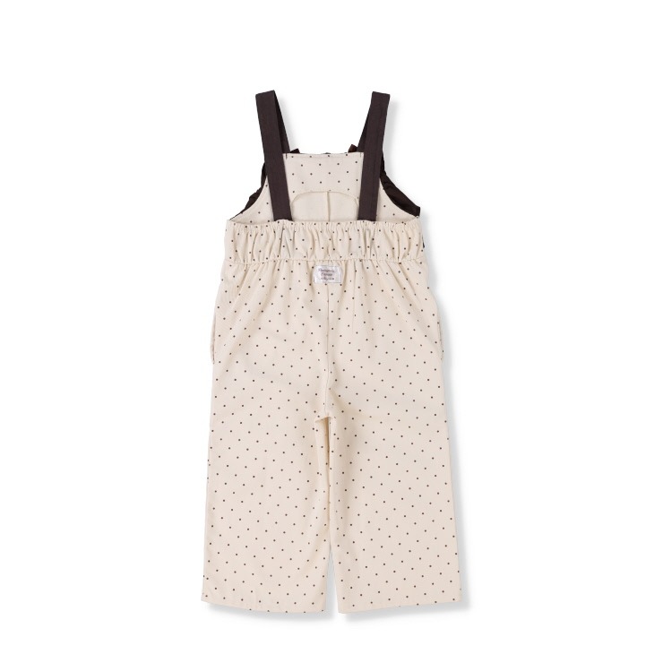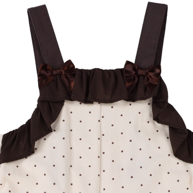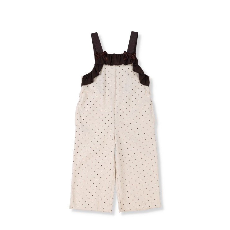 ドット柄の生地と胸元の大きなフリルがキュートなサロペットです。