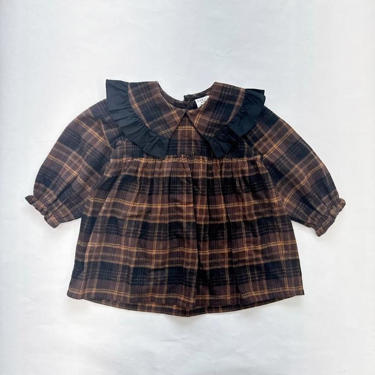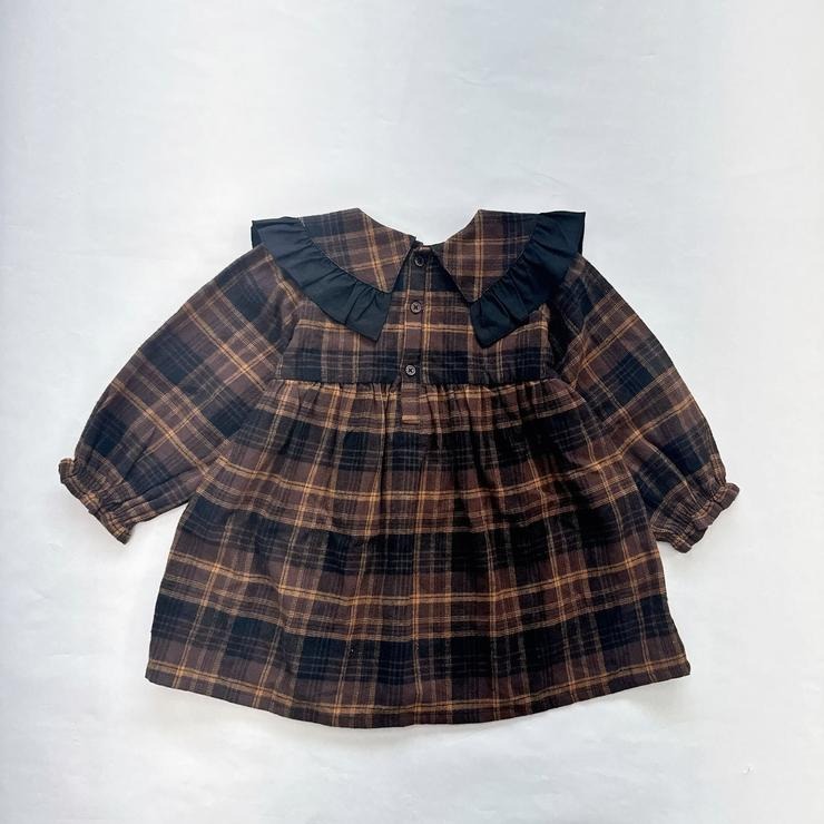 落ち着いたブラウンのチェック柄に衿先のフリル使いがガーリーでおしゃれなアクセントになっています。