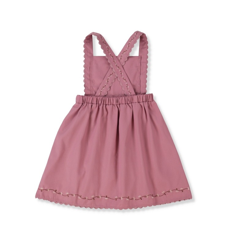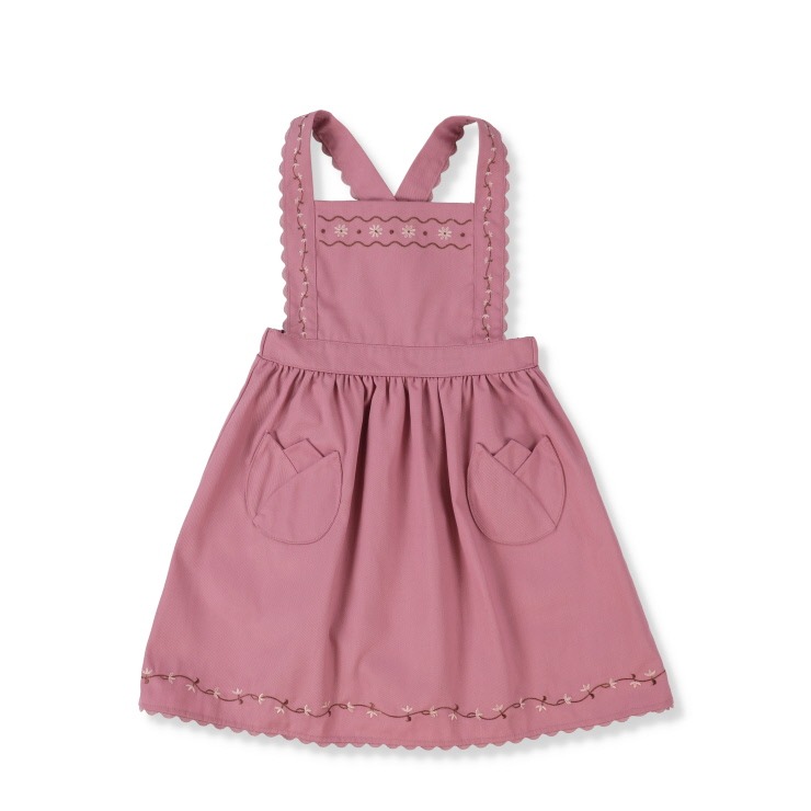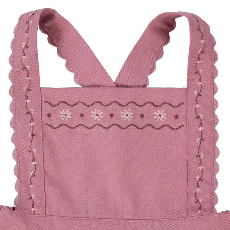 深みのある色合いとお花の刺しゅうがかわいいエプロンワンピースです。