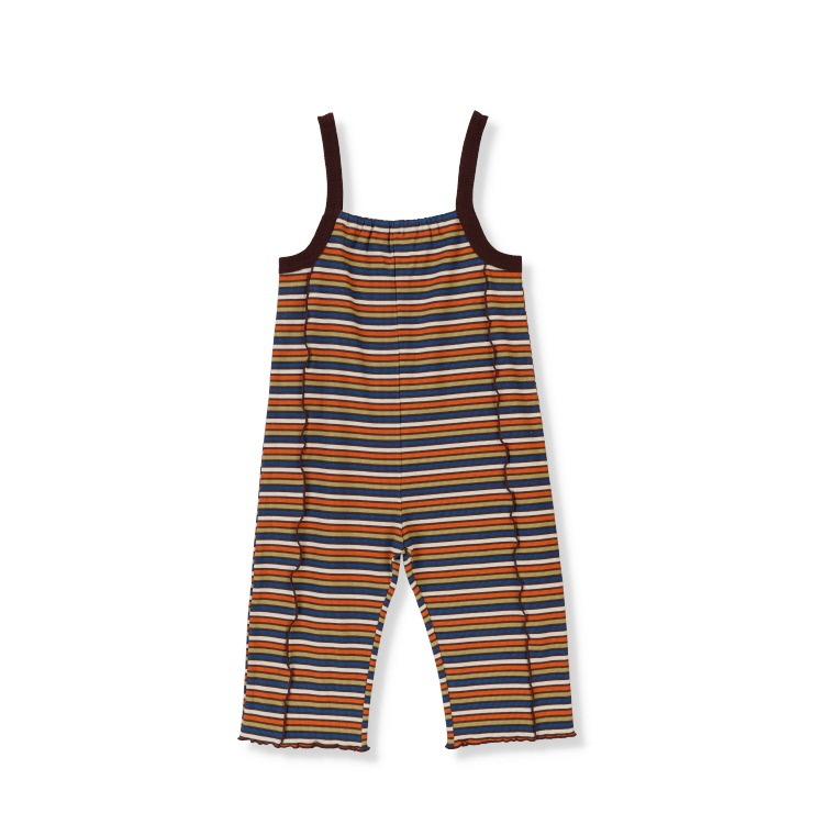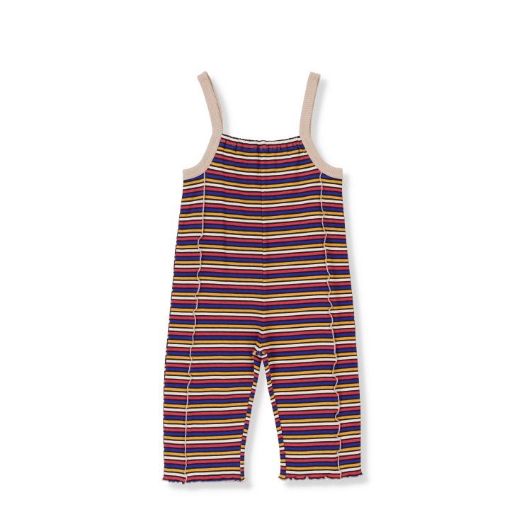 ポップなマルチカラーのボーダーが目を惹くテレコ素材のサロペット。