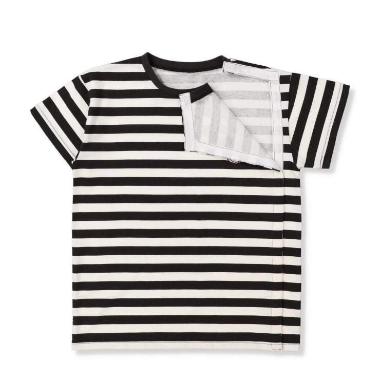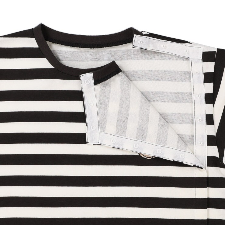 主素材には毛玉になりづらい綿100%素材を使い、寝た状態でも着脱しやすいように肩から脇にかけてスナップボタンで全開になる仕様になっています。抱きかかえた時には背中が出ないように着丈を長めにしてあります。