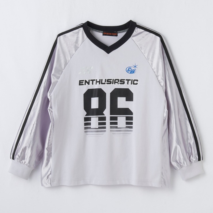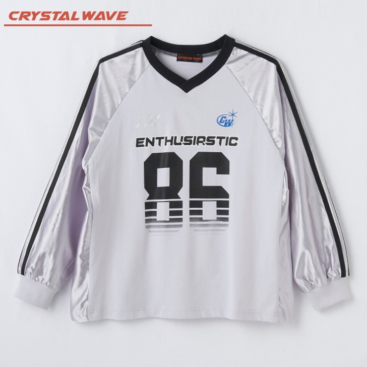 メタリックな配色デザインに大きなナンバリングや首元のリブ使い、袖のラインデザインなどスポーティーでかっこいいです。