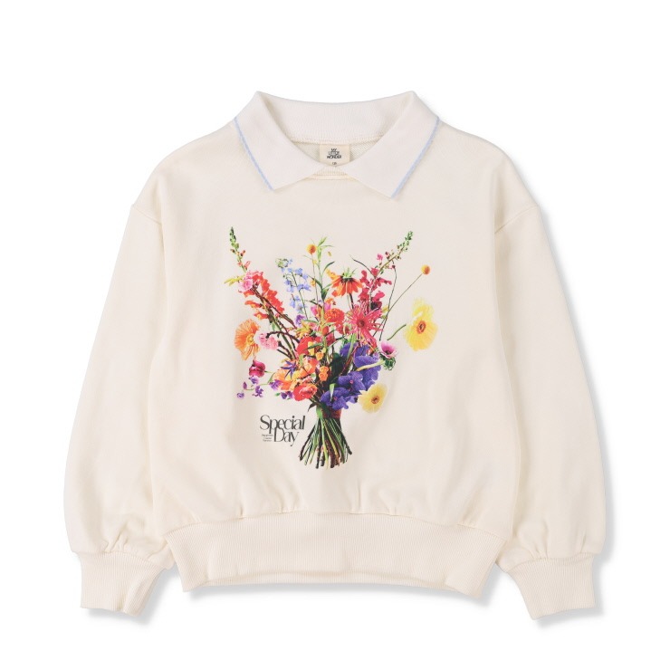 重ね着しているような衿付きデザインにお花の転写プリントがかわいいです。