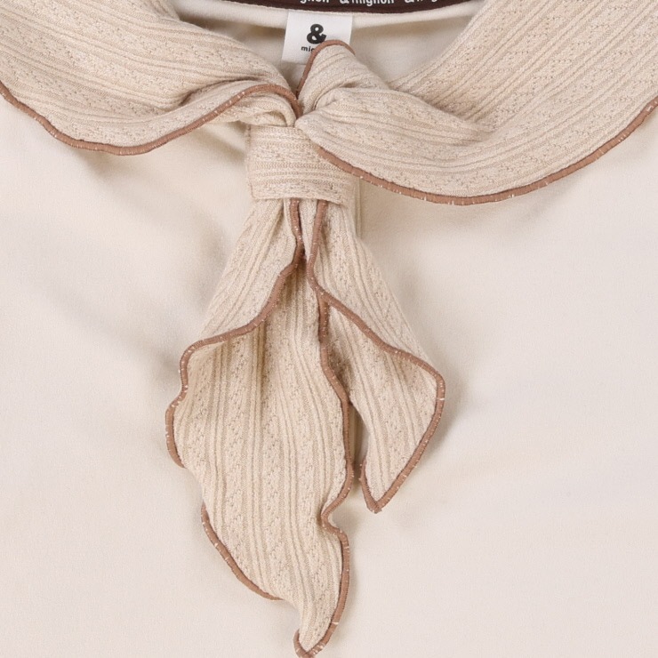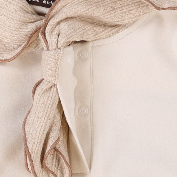 ニットソー素材のスカーフをまいているような衿デザインがおしゃれです。