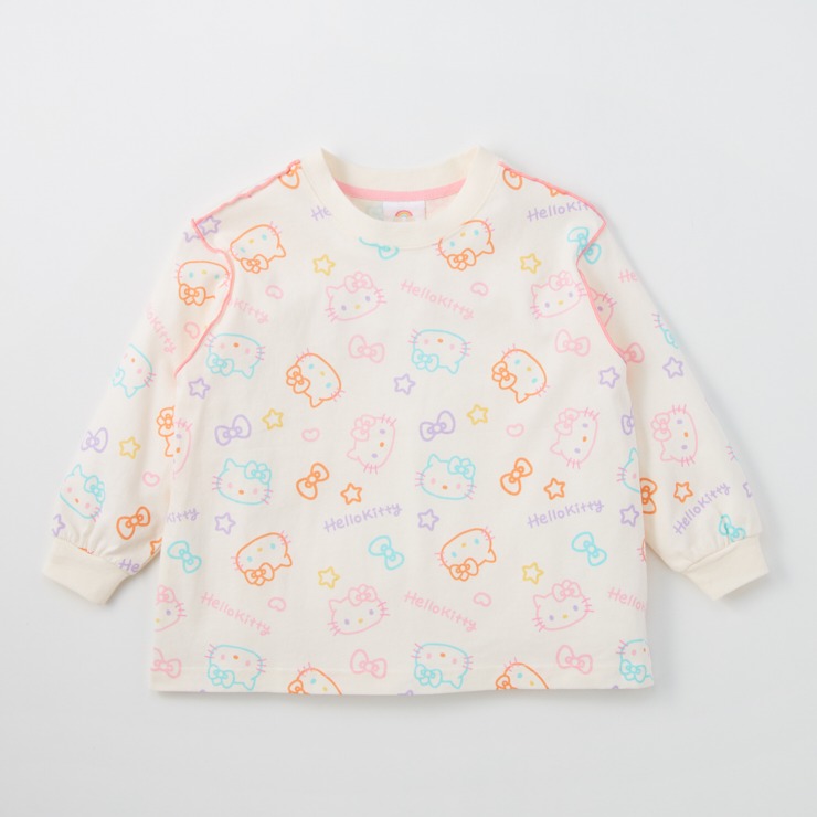 「ハローキティ」がいっぱいのポップなカラーの総柄プリントにメロウ刺しゅうがアクセントになっています。