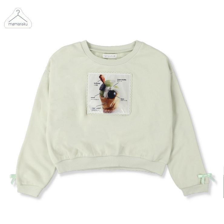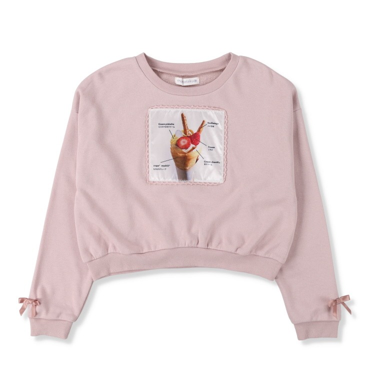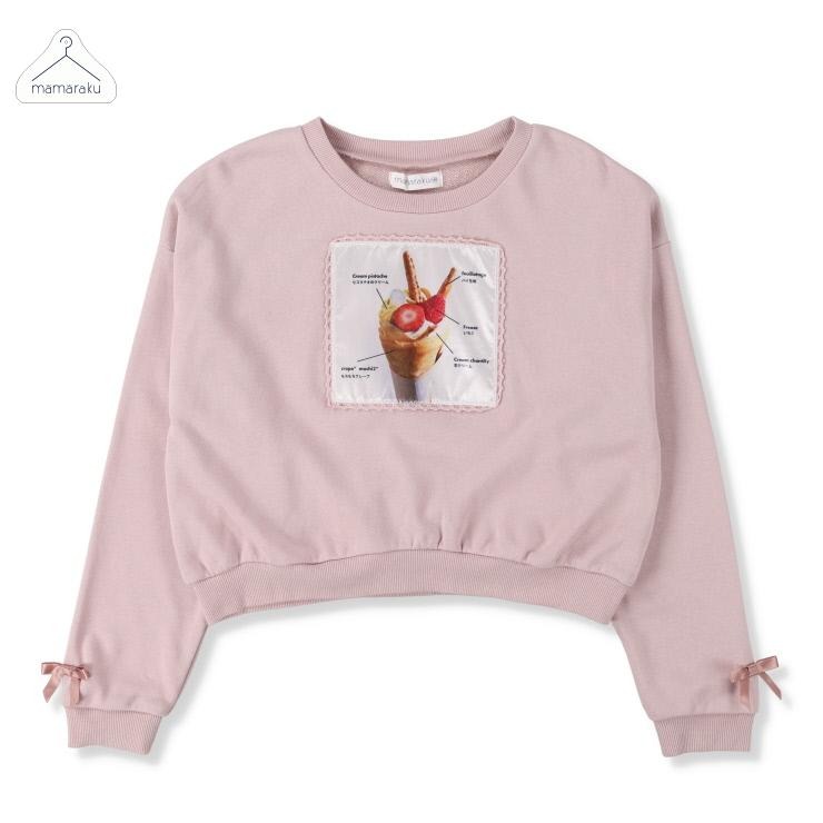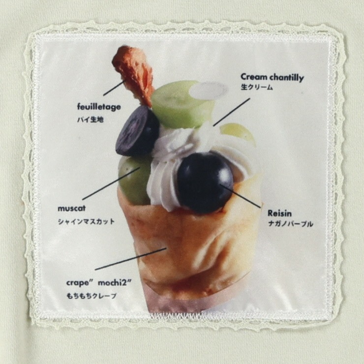 フルーツとクリームがたっぷりのおいしそうなクレープを大きくプリントしたトップスです。