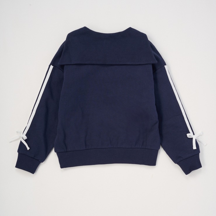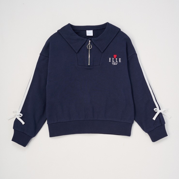 ハーフジップの大きなリブ襟にテープ使い、リボンがついたスポーティーでかわいいデザインになっています。
