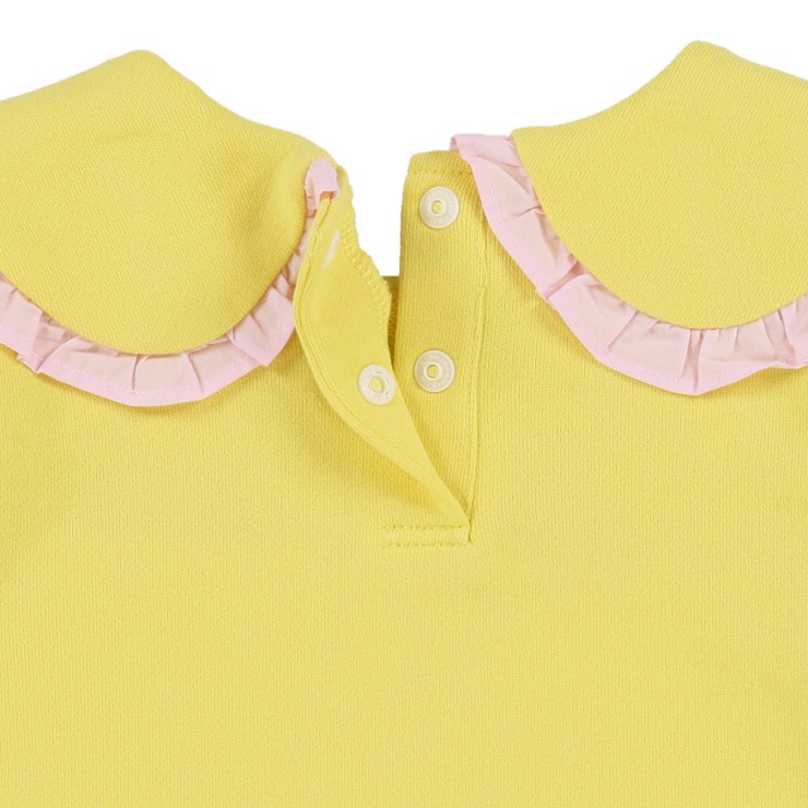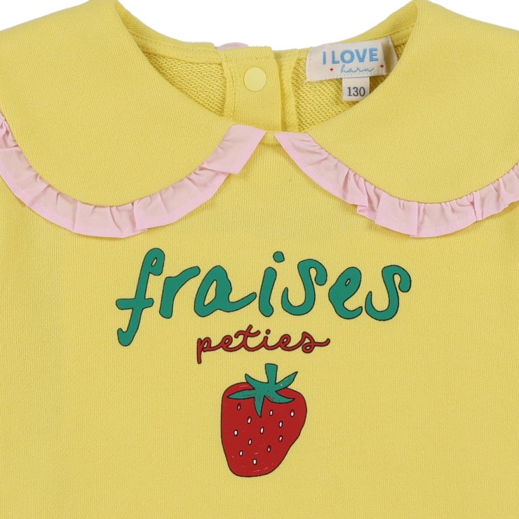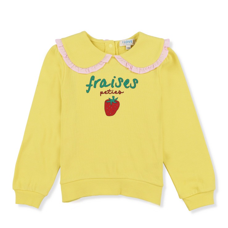 フリルが付いた襟とワンポイントのいちごプリントが女の子らしくて可愛い、コットン100%裏毛を使用したトレーナーです。フリルは重ね着してもかわいいスタイリングになります!