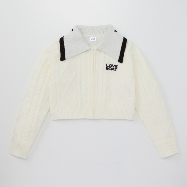 襟のロゴがさりげなくおしゃれなケーブルニットです!