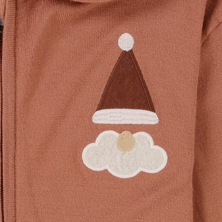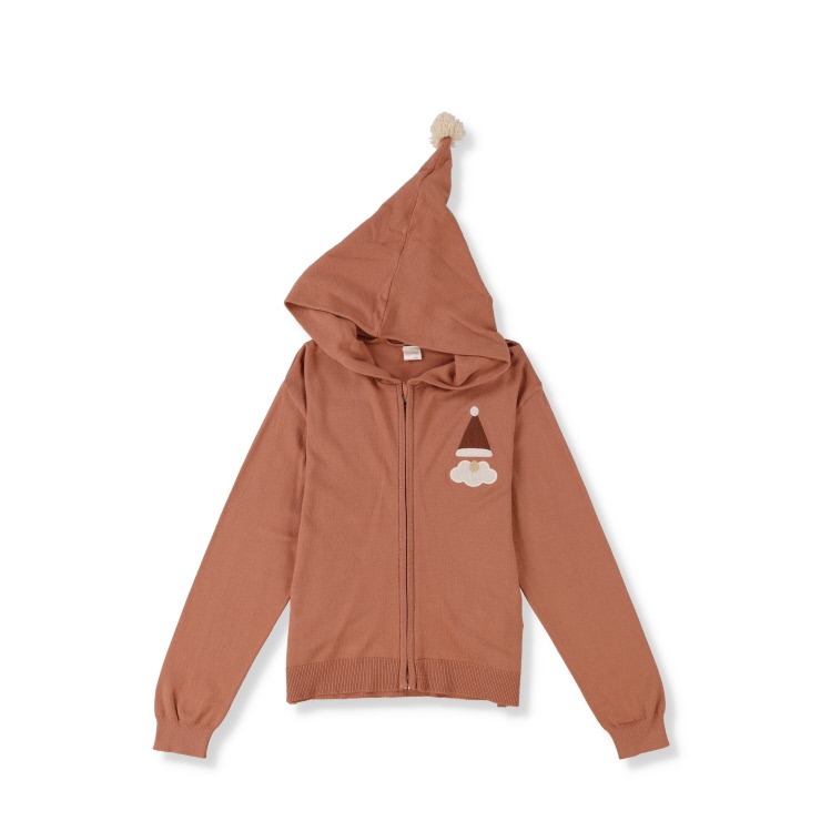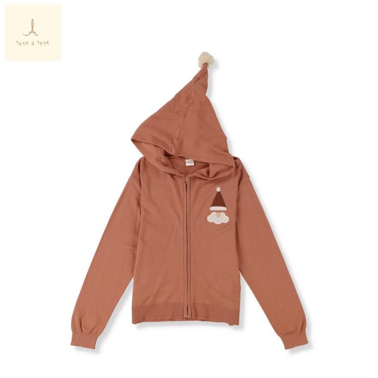 サンタクロースをイメージしたフード先のポンポン使いにフロントのニットアップリケデザインがかわいいです。