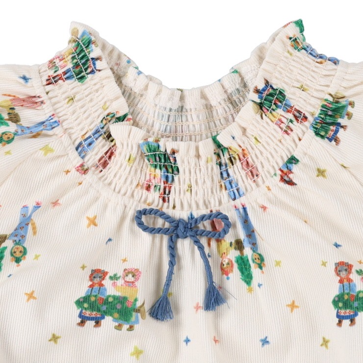 ツリーを運んでいる優しい表情の猫がプリントされたトップスです。
