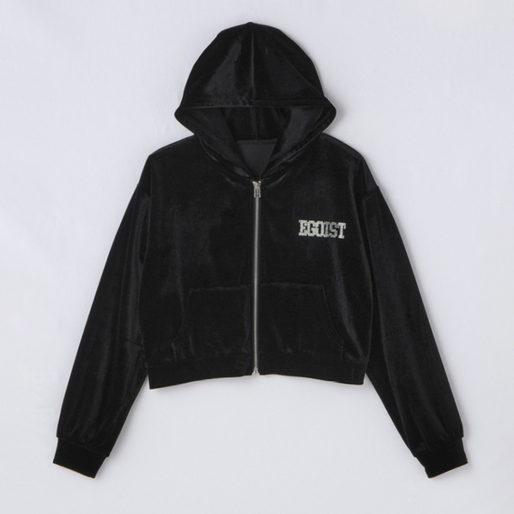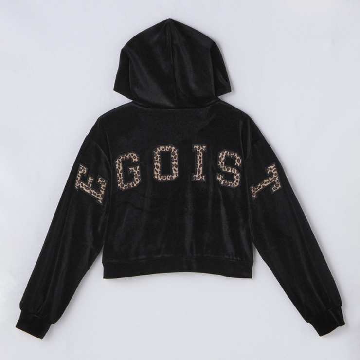 バックのヒョウ柄ロゴと、左胸のラインストーンが目を引く短丈パーカー。