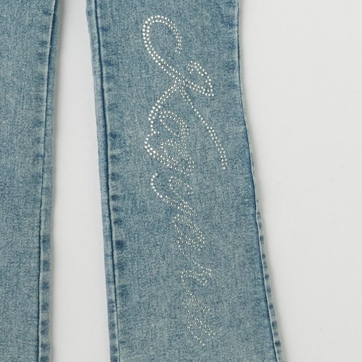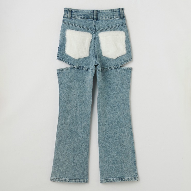 サイドの太もも部分にスリットが入ったデニムフレアパンツです。