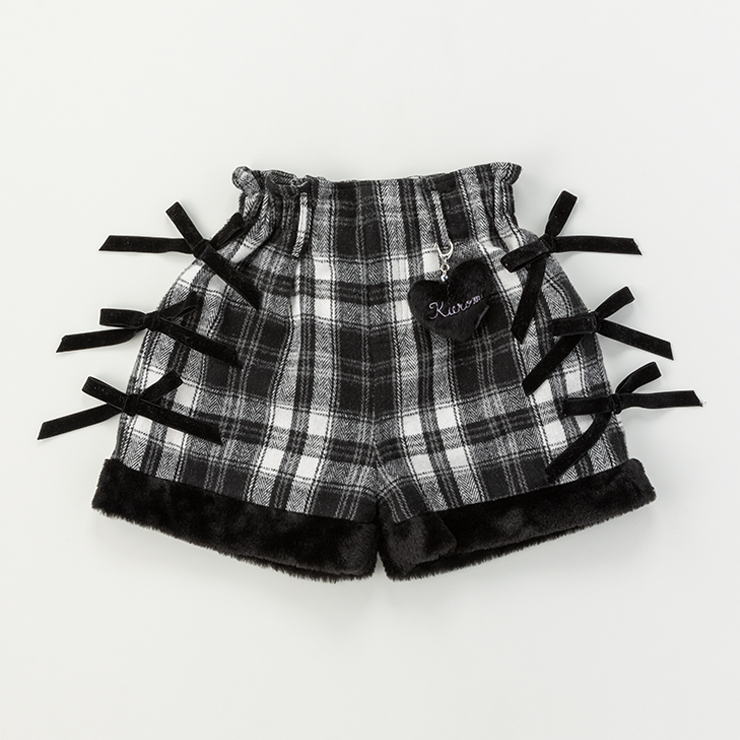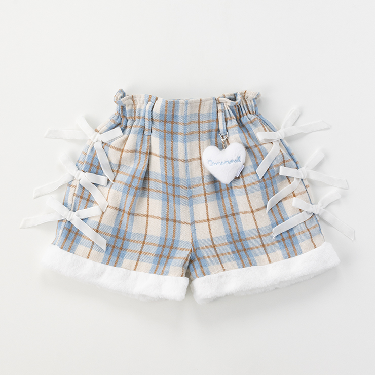 キャラクターのロゴ刺しゅう入りのハートのふわふわチャームがアクセントの、季節ムードを高めてくれるタータンチェック柄ショートパンツ。
