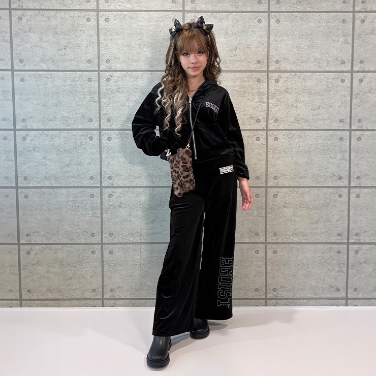 フロントのブランドロゴが目を引くベロアワイドパンツ。