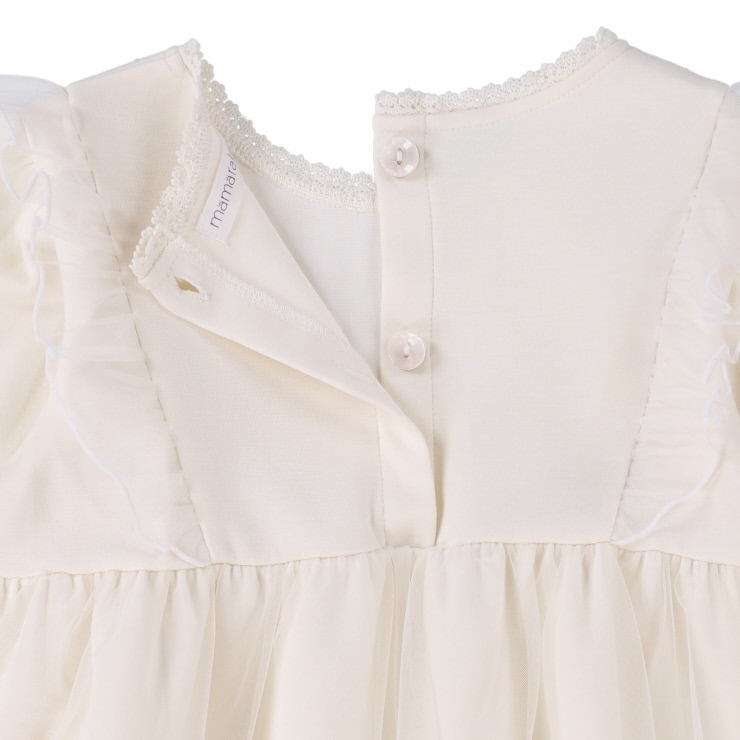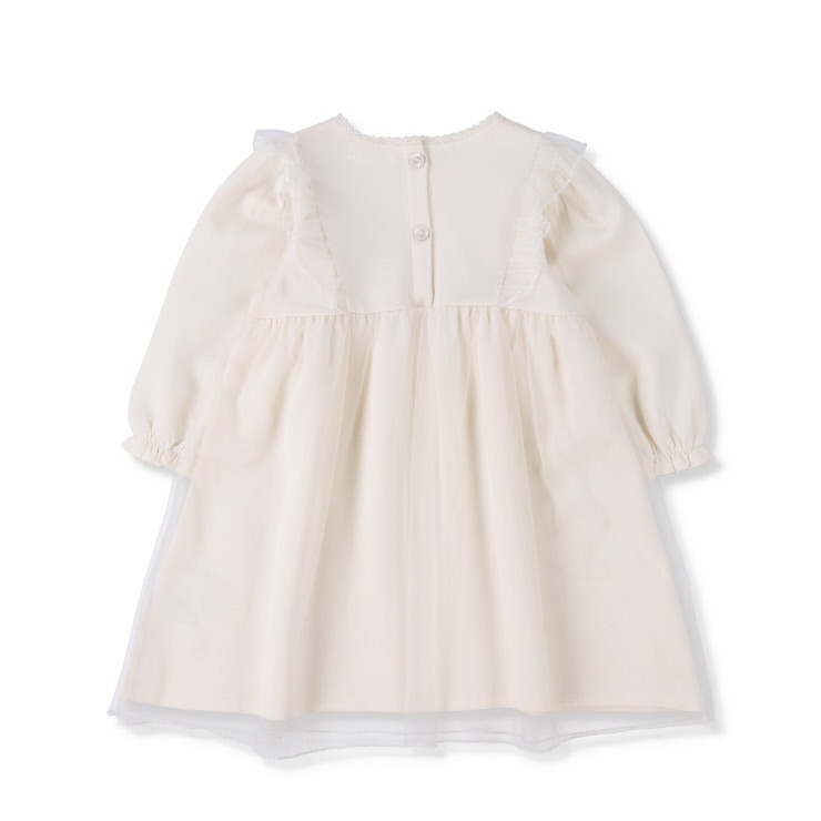 肩のフリルと襟のレースがエレガントなワンピースです。