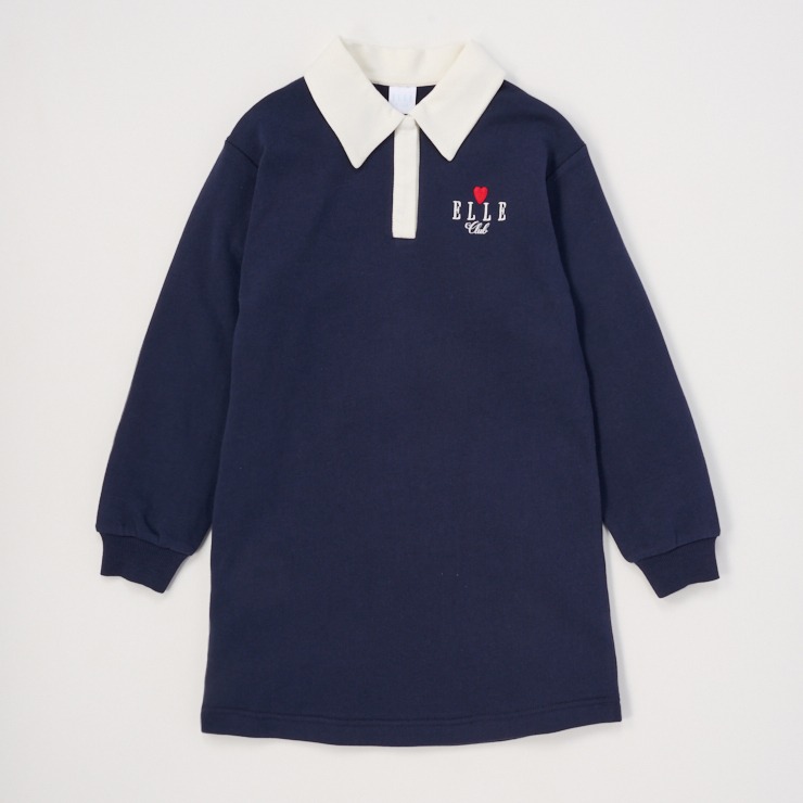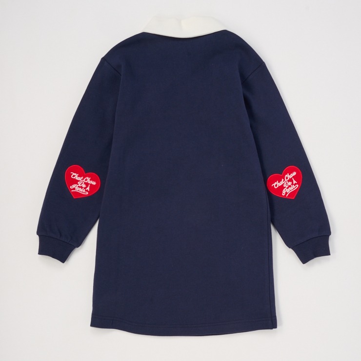 配色の襟付きデザインにハートのアップリケや刺しゅう使いがかわいいアクセントになっています。