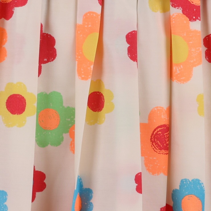 大きな花モチーフとスカート部分のポップな花モチーフが特徴のワンピース。自由な配色と多彩なプリントで、1枚でもジャケットを着ても映えるデザインです!