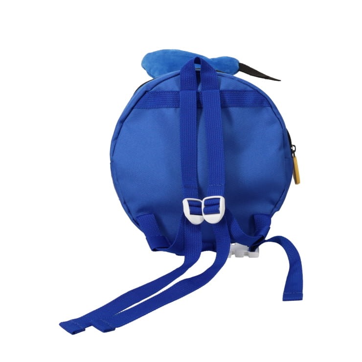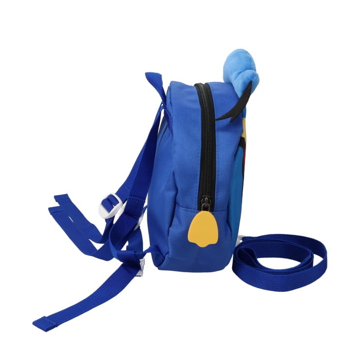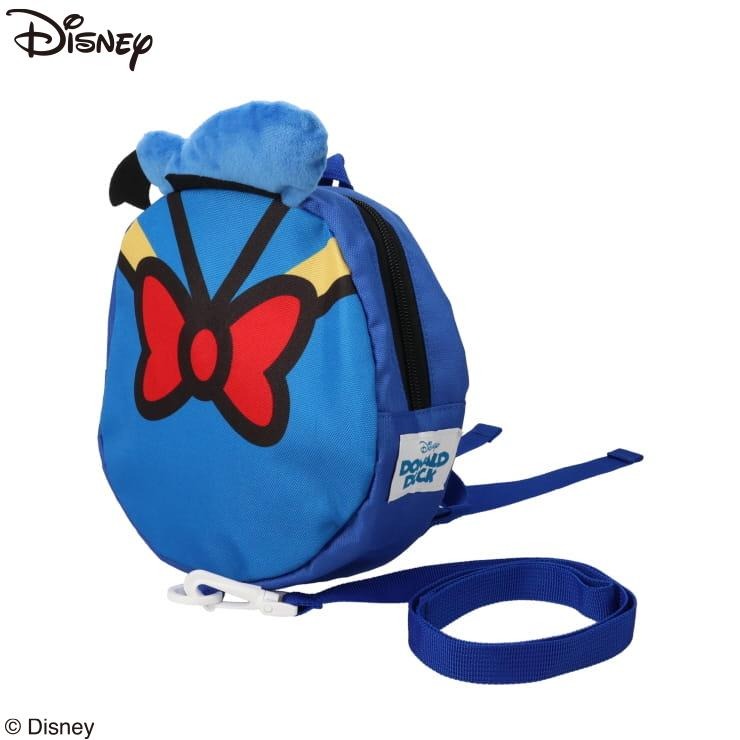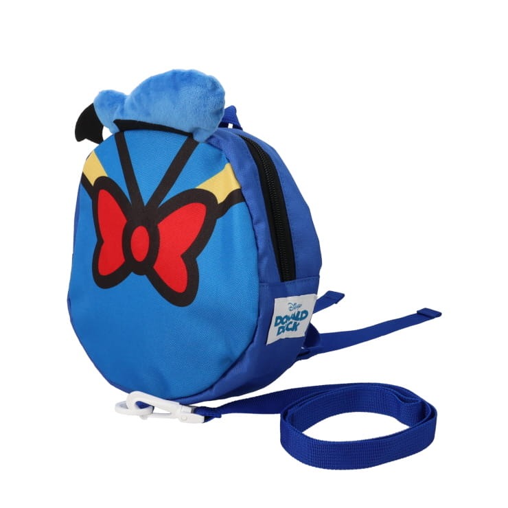 ドナルドダックモチーフ柄の迷子防止ベルトが付いたリュックです。