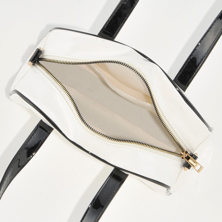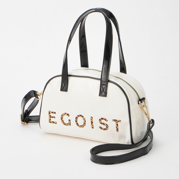 光沢感のあるエナメル素材に、ヒョウ柄プリントのEGOISTロゴを大胆にデザインしたボストンバッグ。