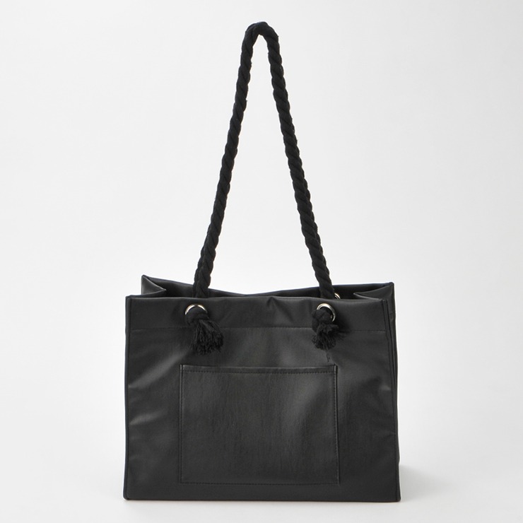 シンプルながらも存在感を放つ、合皮素材のスクエア型トートバッグ。