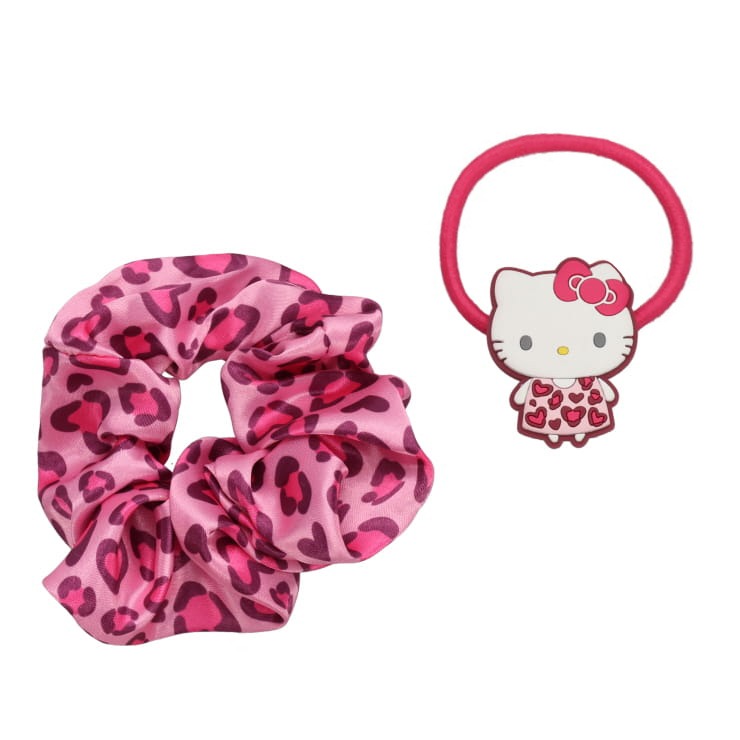 キティちゃんの顔&ひょう柄がアクセントになったデザインで、子供から大人まで幅広く人気。シュシュとヘアゴムがセットになっておりとても便利です。
