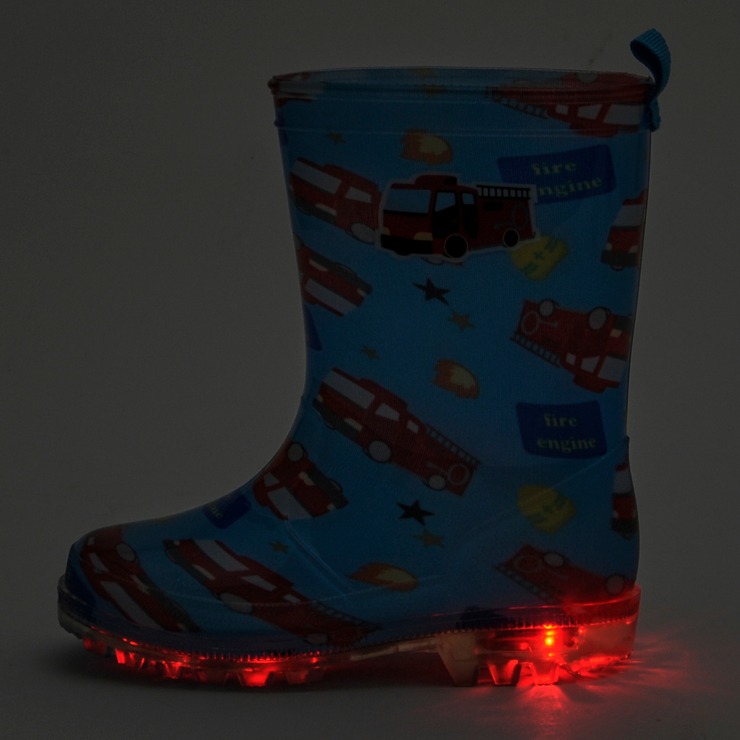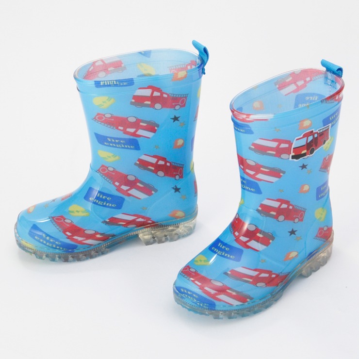 光レインブーツ。元気いっぱいの男の子にぴったりな消防車のレインブーツ。サイドには大きな消防車のワッペン付き。鮮やかな水色をベースに、かっこいい消防車やヘルメット、星のモチーフがちりばめられた、遊び心あふれるデザインです。