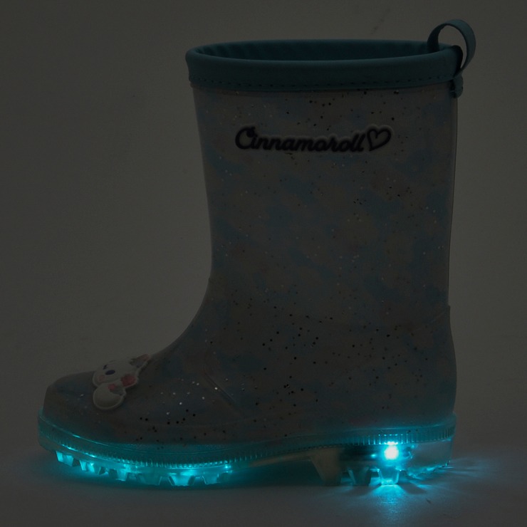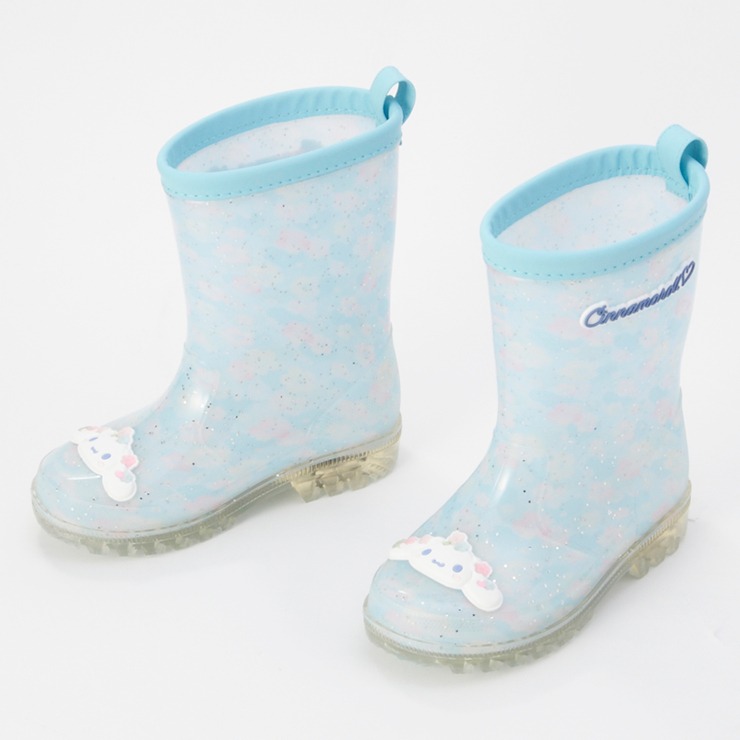 シナモロールの光るレインブーツ。くすんだ花柄にシナモロールPVCワッペン。女の子らしいサックスカラーが上品にシルエットされているデザインです。