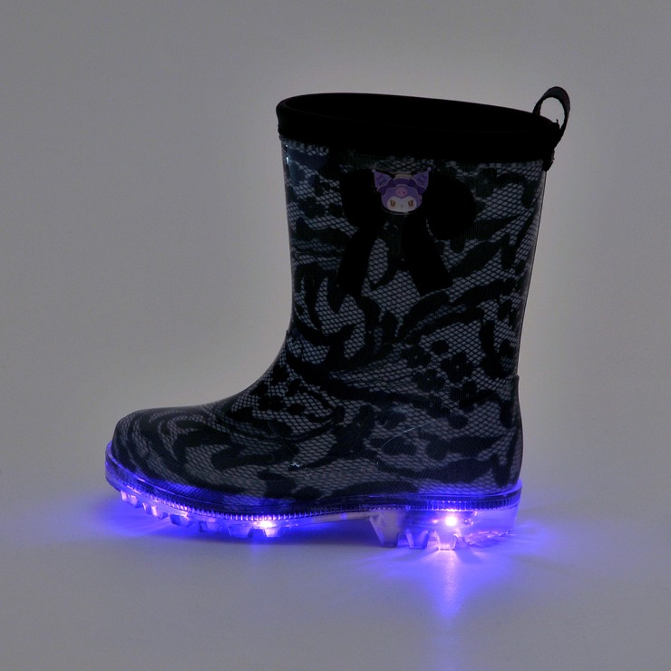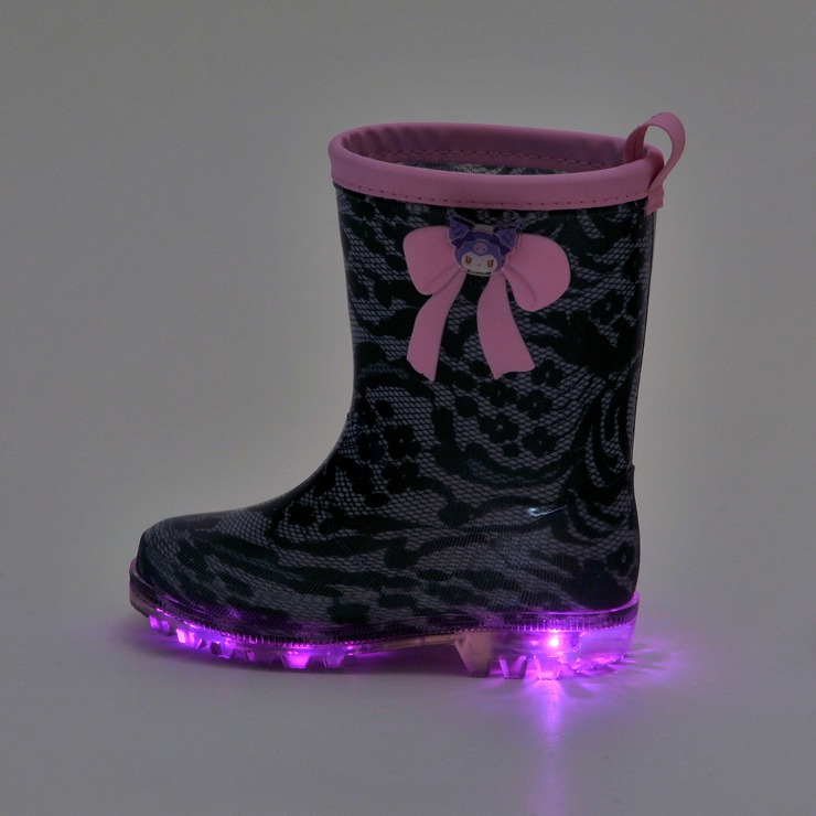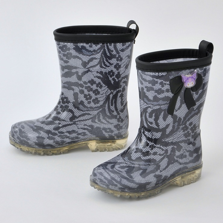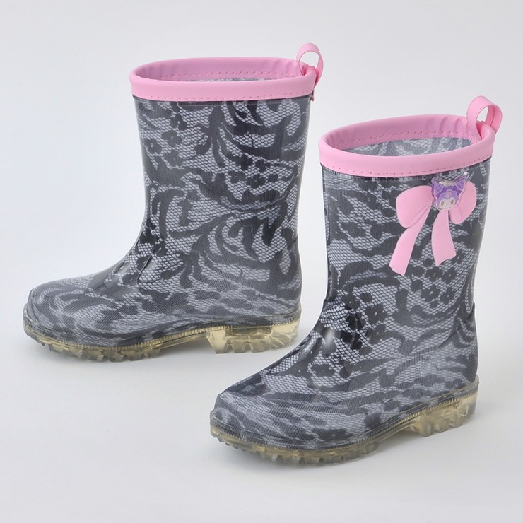 ピカピカ光るクロミレインブーツ。全面に黒レースでデザインされている品のある商品です。 エレガントな仕様になっており、毎日でも楽しく履いて頂ける商品です。 黒カラーのシルエットにサイド部分には大きなリボン付き。ワンポイントとして、クロミの飾りがあるのもオシャレです。