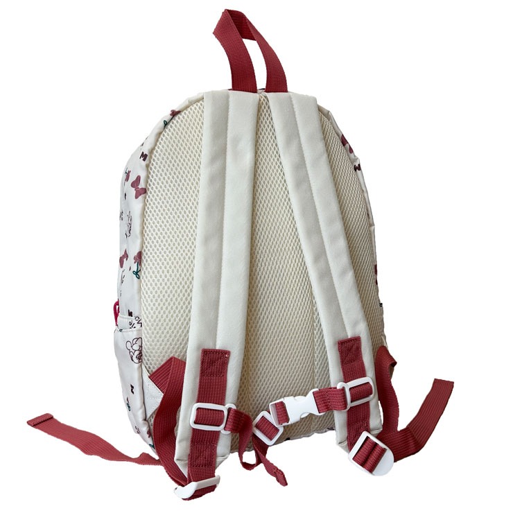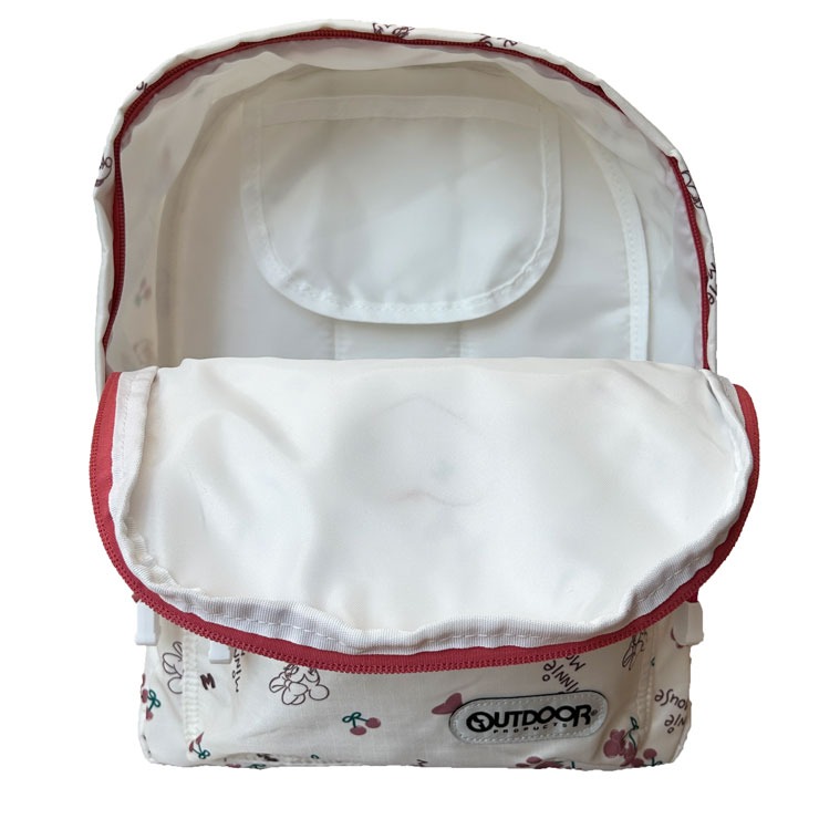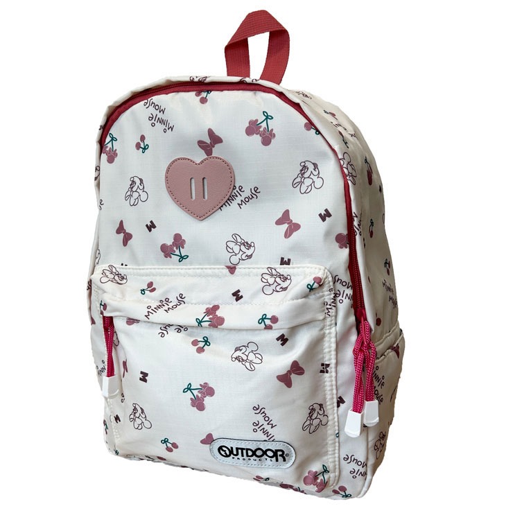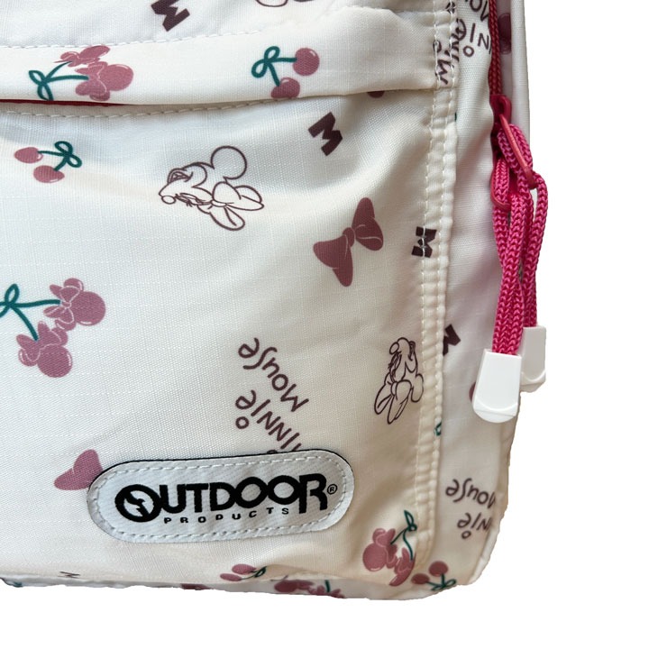「ミニーマウス」チェリー柄とOUTDOORブランドがコラボした定番人気形状のデイパックです。フロントには大き目のファスナー付きポケット、両サイドにはペットボトルなどが入るオープンポケットが付いています。内側には小物が入れられるオープンポケットが付いています。背面は通気性に優れたメッシュ素材を使用し、クッション入りで肩の負担を軽減します。チェストベルトが付いているので肩がずれ落ちにくいです。