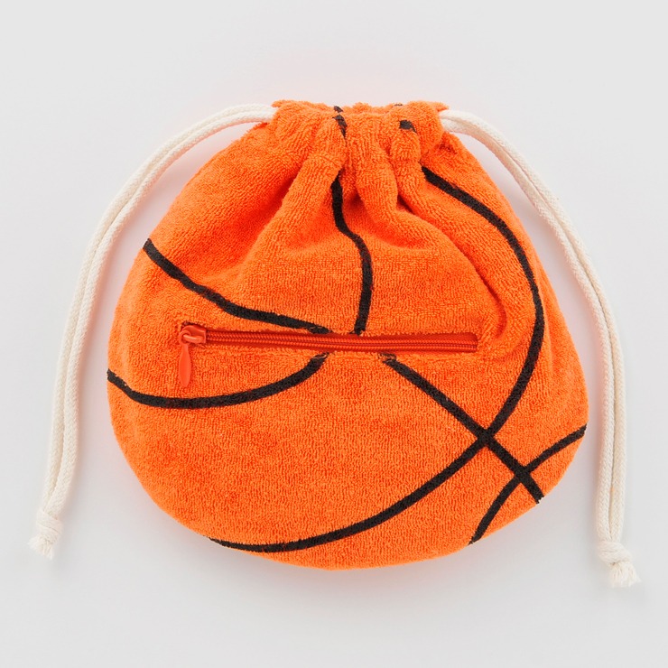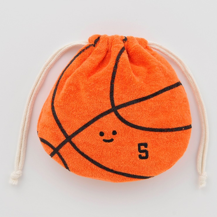 肌触りの良いパイル素材で口のひもを絞ればまあるいバスケットボールに!