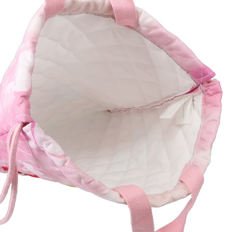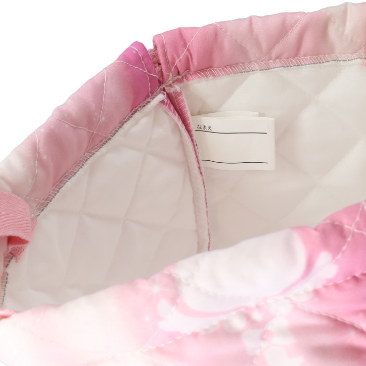 小さな妖精「ティニピン」がデザインされたキルトナップサック。暖かみのあるキルティング素材で、内側には名前が書けるネームタグが付いています。