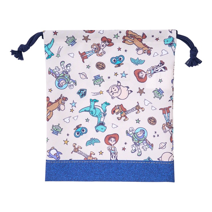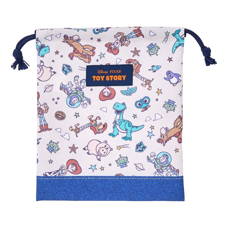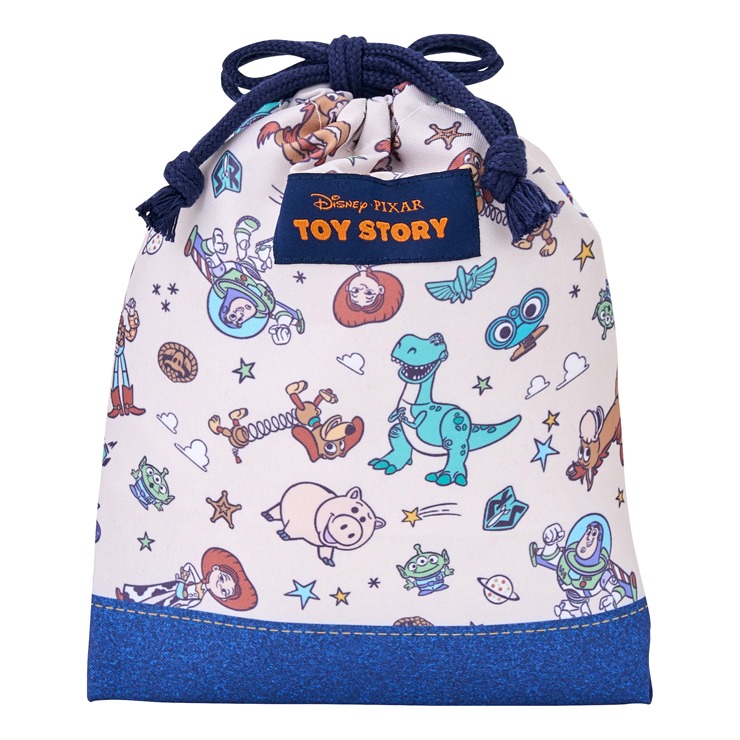 『トイ・ストーリー』がデザインされたキンチャク。キンチャクM、Lとランチキンチャク、コップ袋、ランチクロス、レッスンバッグ、ナップサック、シューズバッグの展開なので一式揃えて合わせられます。内側には名前が書けるネームタグが付いています。