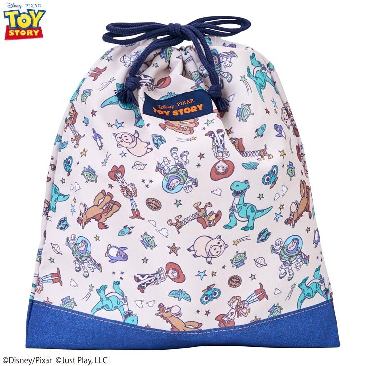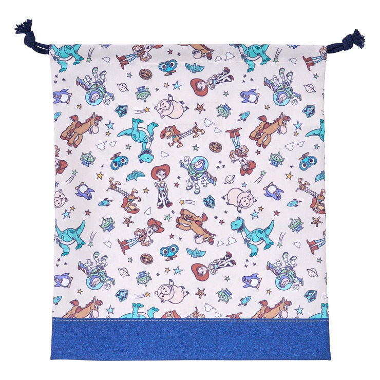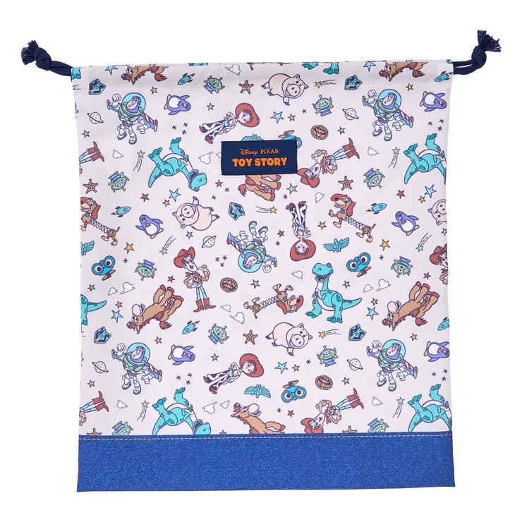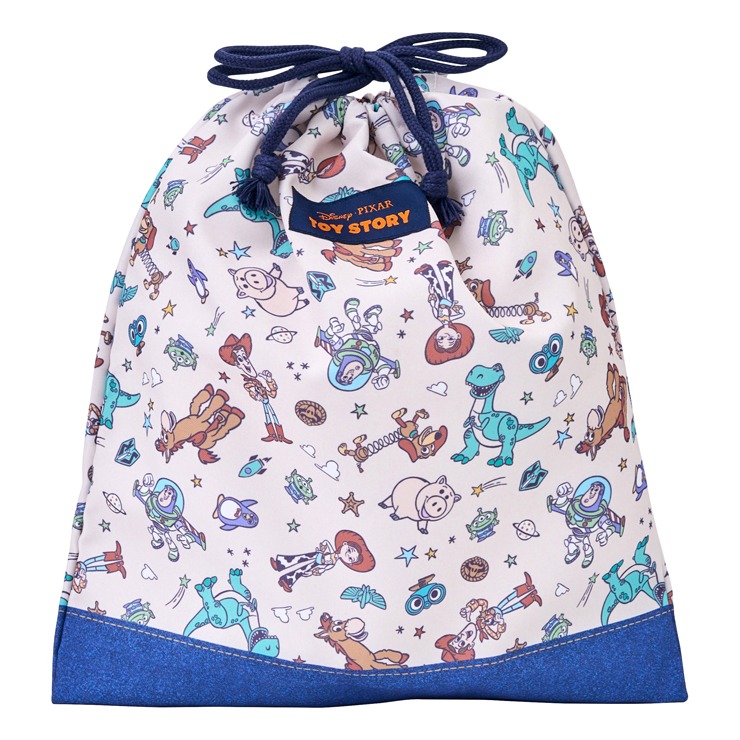 『トイ・ストーリー』がデザインされたキンチャク。キンチャクS、Mとランチキンチャク、コップ袋、ランチクロス、レッスンバッグ、ナップサック、シューズバッグの展開なので一式揃えて合わせられます。内側には名前が書けるネームタグが付いています。