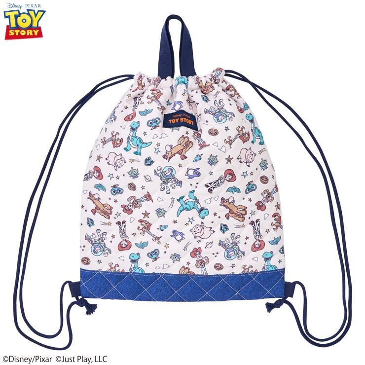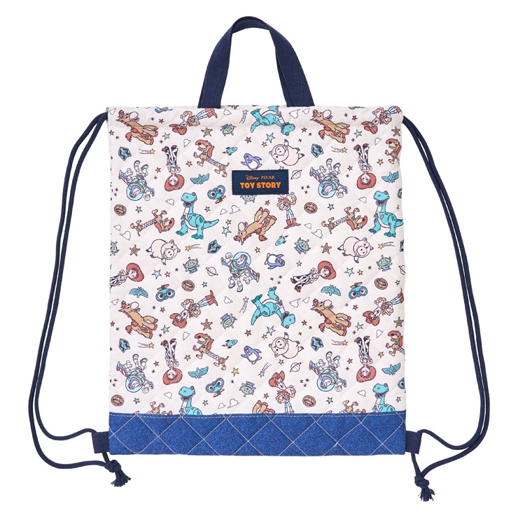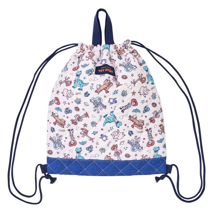 『トイ・ストーリー』がデザインされたナップサック。温かみのあるキルティング素材で、キンチャクS,M,Lとランチキンチャク、コップ袋、ランチクロス、レッスンバッグ、シューズバッグの展開なので一式揃えて合わせられます。内側には名前が書けるネームタグが付いています。