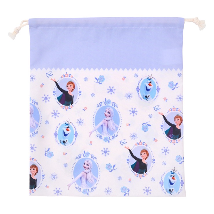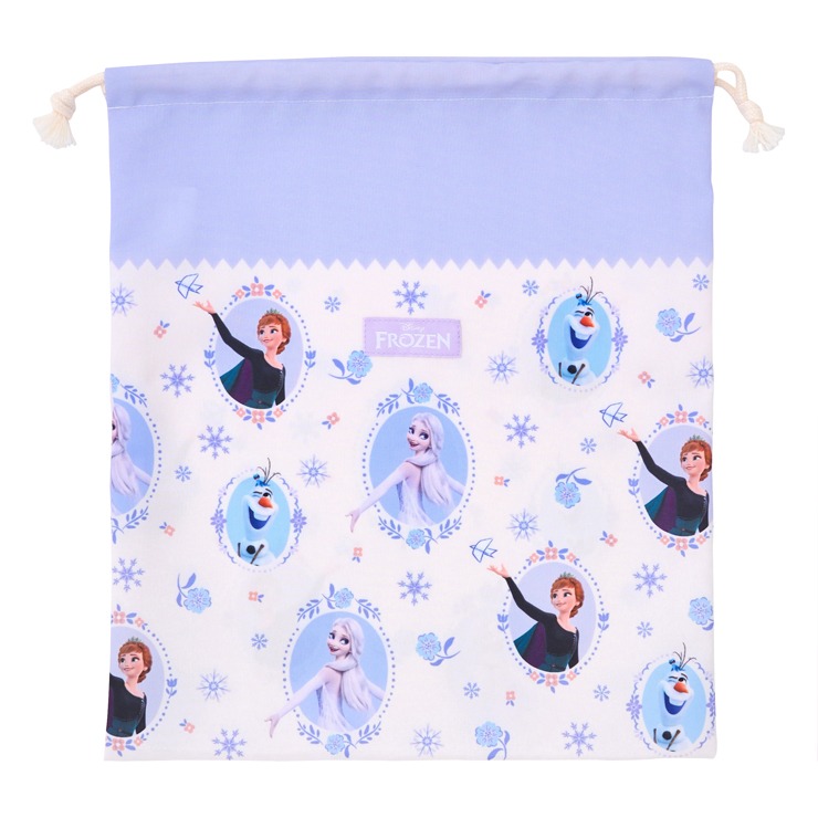 『アナと雪の女王』がデザインされたキンチャク。キンチャクS,Mとランチキンチャク、コップ袋、ランチクロス、レッスンバッグ、ナップサック、シューズバッグの展開なので一式揃えて合わせられます。内側には名前が書けるネームタグが付いています。