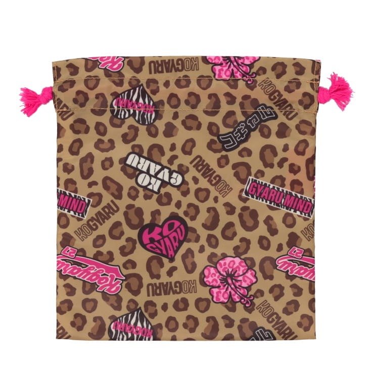 ヒョウ柄にKOGYARUロゴやハイビスカスを散りばめたギャルらしいデザインで、ピンクの紐がアクセントです。