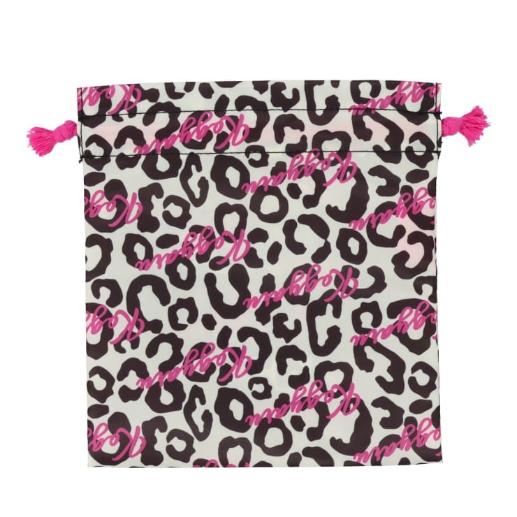 ブラックのヒョウ柄にピンクのロゴを組み合わせたオトナかわいいデザインで、ピンクの紐がアクセントです。