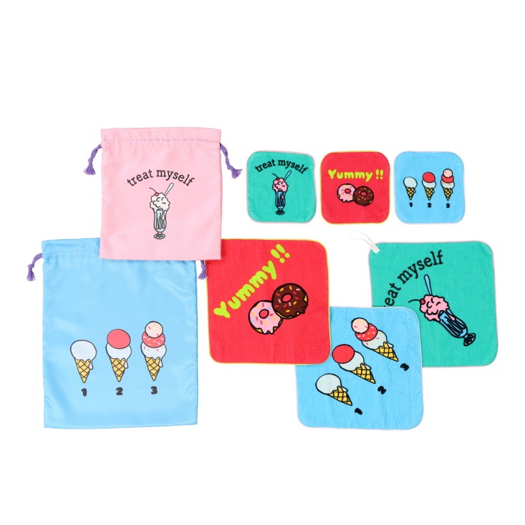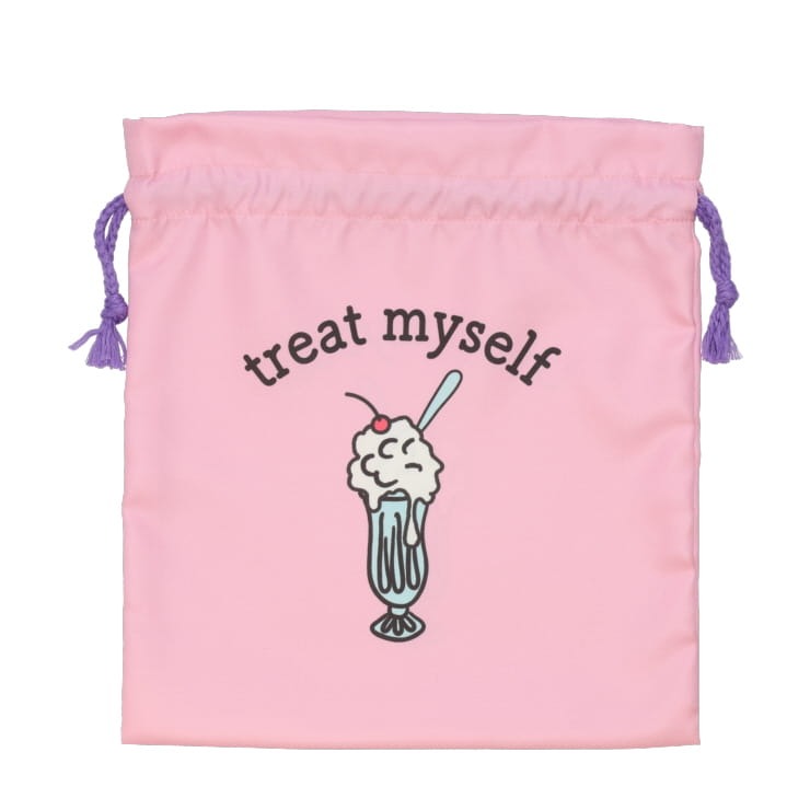カラフルな色味で使っているだけで毎日が明るい気持ちになるようなスイーツ柄の巾着♪