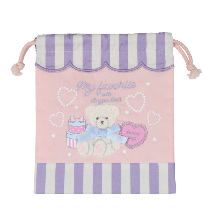 ストライプ柄とスカラップ仕様が可愛いクマモチーフの巾着袋です♪