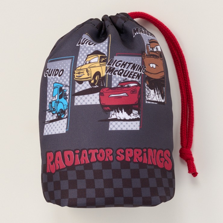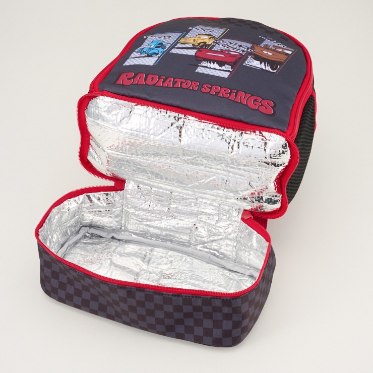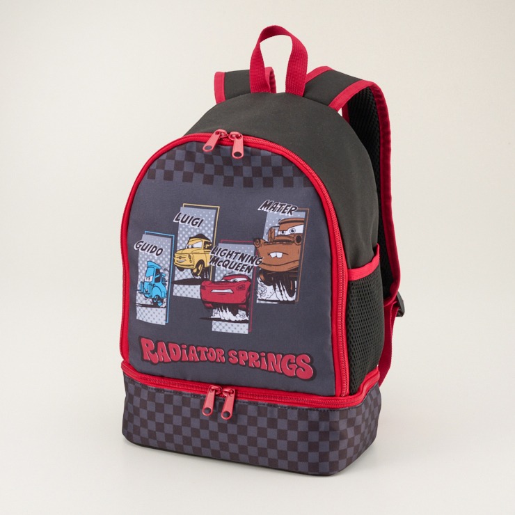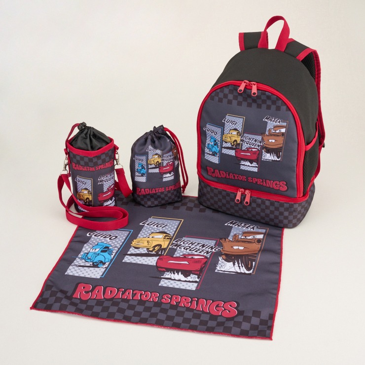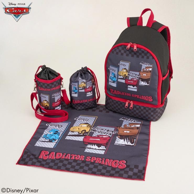 公園などでランチをする場面で使いたくなるランチグッズ4点セット。リュックは二層式で、下段はアルミ蒸着を使用し保冷効果があります。人気のキャラクター『カーズ』がプリントされています。
