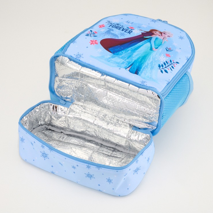 公園などでランチをする場面で使いたくなるランチグッズ4点セット。リュックは二層式で、下段はアルミ蒸着を使用し保冷効果があります。人気のキャラクター『アナと雪の女王』がプリントされています。
