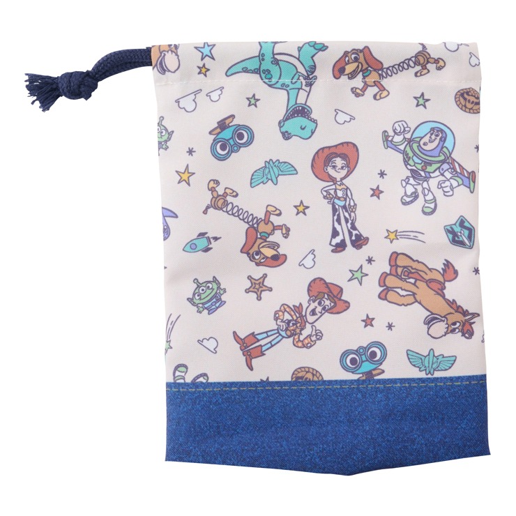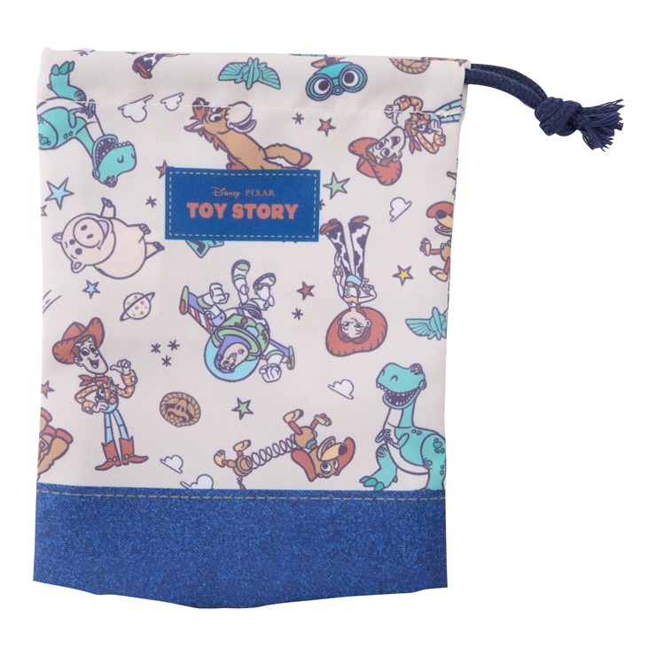 『トイ・ストーリー』がデザインされたコップ袋。キンチャクS、M,Lとランチキンチャク、ランチクロス、レッスンバッグ、ナップサック、シューズバッグの展開なので一式揃えて合わせられます。内側には名前が書けるネームタグが付いています。