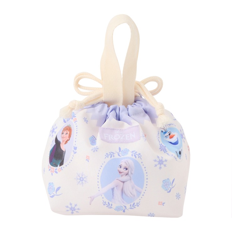 『アナと雪の女王』がデザインされたランチキンチャク。キンチャクS、M,Lとコップ袋、ランチクロス、レッスンバッグ、ナップサック、シューズバッグの展開なので一式揃えて合わせられます。内側には名前が書けるネームタグが付いています。