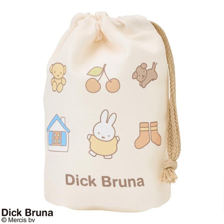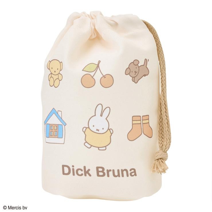 アイコン柄がデザインされたmiffyのコップ袋。キンチャクS,M,Lとランチキンチャク、ランチクロスとレッスンバッグ、シューズバッグの展開なので一式揃えて合わせられます。内側には名前が書けるネームタグが付いています。