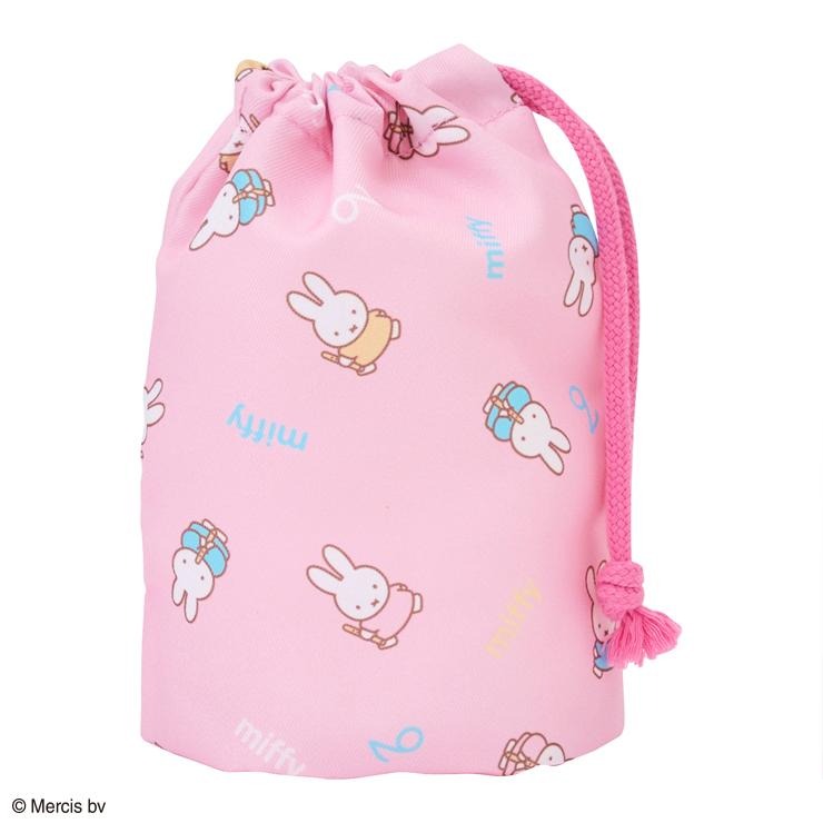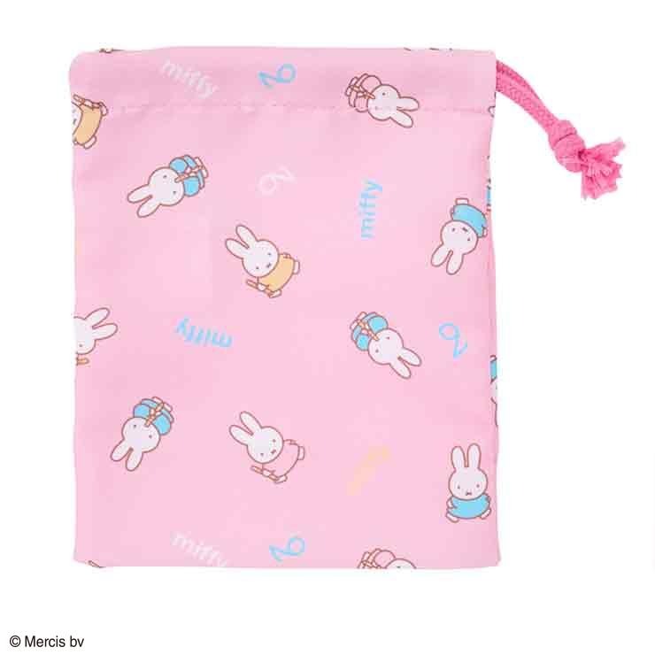 miffyと音符が総柄でデザインされたコップ袋。キンチャクS,M,Lとランチキンチャク、ランチクロスとレッスンバッグ、シューズバッグの展開なので一式揃えて合わせられます。内側には名前が書けるネームタグが付いています。