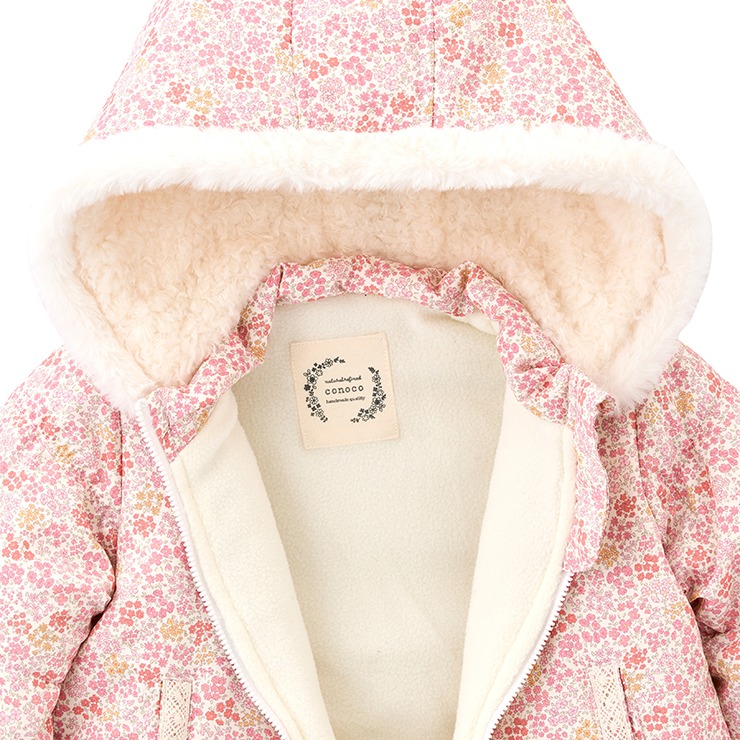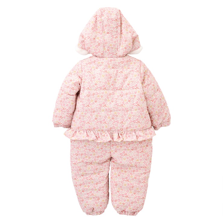 可憐な小花柄がちりばめられた、中綿入りのジャンプスーツです。フードのふわふわボアとウエストのフリルが、お子様の可愛らしさを引き立てます。全身を優しく包み込み、寒い日のお出かけも安心です。
